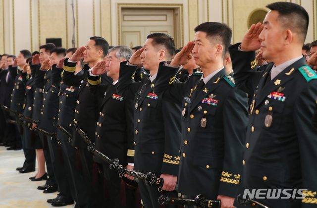 【서울=뉴시스】전신 기자 = 8일 청와대 영빈관에서 열린 지상작전사령부 창설 부대기 및 준장 진급자 삼정검 수여식에서 수여 대상자들이 문재인 대통령에게 거수경례하고 있다. 2019.01.08.