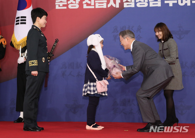 【서울=뉴시스】전신 기자 = 문재인 대통령이 8일 청와대 영빈관에서 열린 지상작전사령부 창설 부대기 및 준장 진급자 삼정검 수여식에서 노경희 3사단 부사단장에게 삼정검을 수여한 후 딸 김시현 양에게 꽃다발은 전달하고 있다. 2019.01.08.