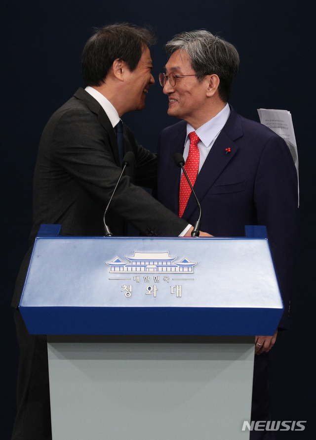 【서울=뉴시스】박진희 기자 = 임종석 비서실장이 8일 청와대 춘추관 대브리핑룸에서 신임 비서실장 등 인사를 발표한 후 노영민 신임 비서실장과 포옹으로 인사하고 있다. 문재인 대통령은 이날 임종석 대통령 비서실장 후임으로 노영민(62) 주중국대사를, 한병도 정무수석의 후임으로는 강기정(55) 전 더불어민주당 의원을, 윤영찬 국민소통수석 후임엔 윤도한(58) 전 MBC 논설위원을 각각 임명했다. 2019.01.08.