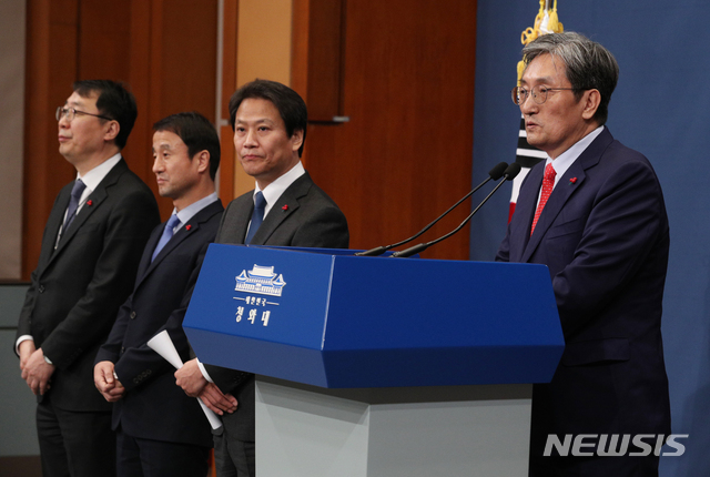 【서울=뉴시스】박진희 기자 = 노영민 신임 비서실장이 8일 청와대 춘추관 대브리핑룸에서 소감을 밝히고 있다. 문재인 대통령은 이날 임종석 대통령 비서실장 후임으로 노영민(62) 주중국대사를, 한병도 정무수석의 후임으로는 강기정(55) 전 더불어민주당 의원을, 윤영찬 국민소통수석 후임엔 윤도한(58) 전 MBC 논설위원을 각각 임명했다. 2019.01.08.