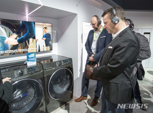 【서울=뉴시스】미국 라스베이거스에서 열리는 세계 최대 전자 전시회 CES 2019 개막일인 8일(현지시간) 삼성전자 전시관에서 바이어들이 CES 2019 혁신상을 수상한 세탁기를 살펴보고 있다. 2019.01.09. (사진=삼성전자 제공)