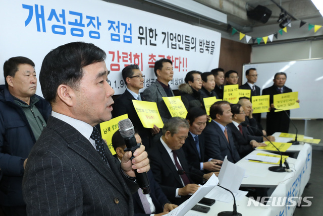 【서울=뉴시스】이윤청 수습기자 = 개성공단기업 입주기업인 일동이 9일 오전 서울 종로구 참여연대에서 개성공단기업 비상대책위원회 기자회견을 열고 있다. 2019.01.09.