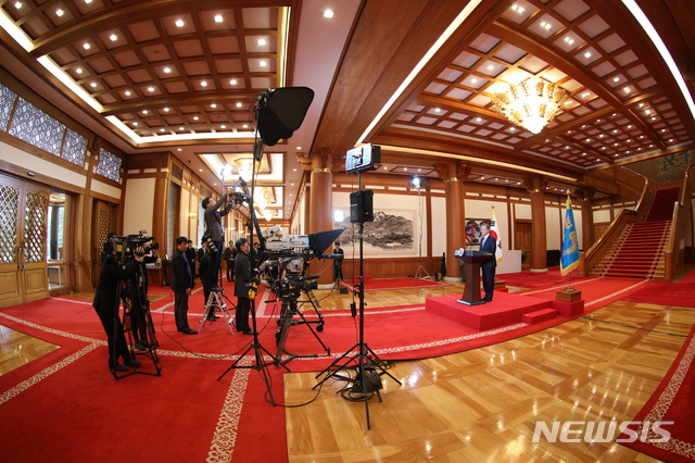 【서울=뉴시스】박진희 기자 = 문재인 대통령이 10일 청와대 본관에서 '2019 문재인 대통령 신년기자회견'에 앞서 신년사를 하고 있다. 2019.01.10.