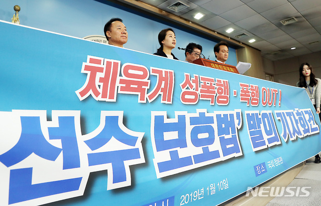 【서울=뉴시스】이종철 기자 = 안민석 국회 문체위원장을 비롯한 여,야 의원들이 10일 서울 여의도 국회 정론관에서 체육계 성폭행, 폭행 OUT! 심석희법 발의 기자회견을 하고 있다. 2019.01.10.