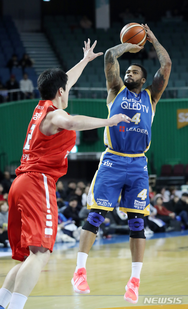 【서울=뉴시스】이영환 기자 = 10일 오후 서울 송파구 잠실실내체육관에서 열린 2018-2019 SKT 5GX 프로농구 서울 삼성 썬더스와 서울 SK 나이츠의 경기, 삼성 유진 펠프스가 슛을 시도하고 있다. 2019.01.10.