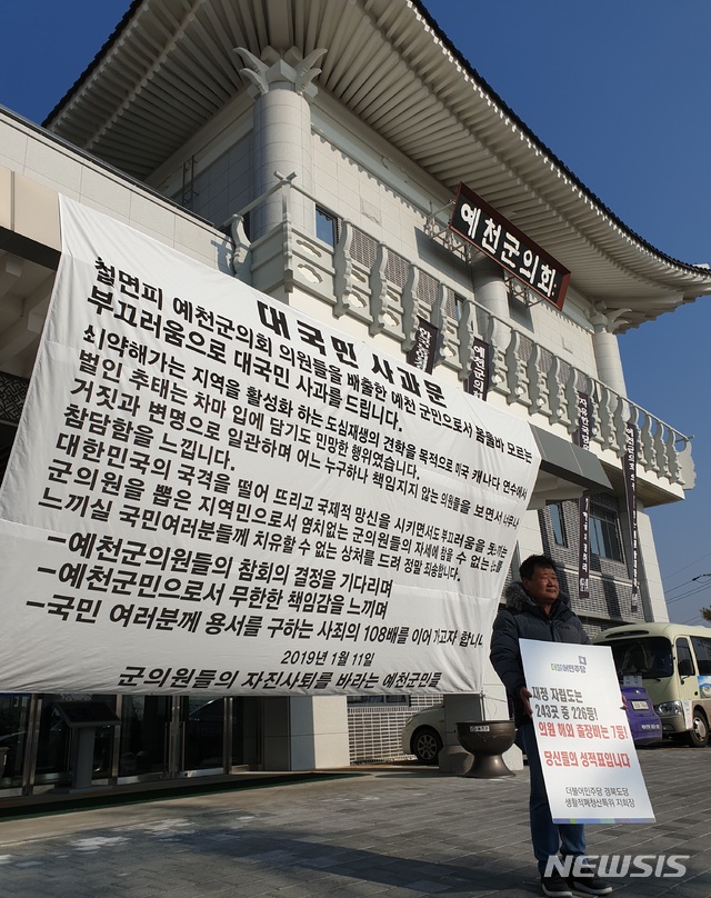 【예천=뉴시스】김진호 기자 = 11일 '추태 외유' 논란을 빚고 있는 경북 예천군의회 청사 앞에 '철면피 예천군의회 의원들을 배출한 예천군민으로서 몸둘 바 모르는 부끄러움으로 대국민 사과를 드립니다'라는 문구의 대국민 사과문이 게시돼 있다. 2019.01.11