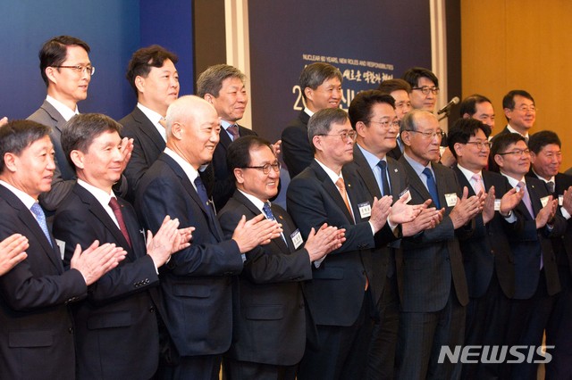 【서울=뉴시스】유영민 과학기술정보통신부 장관이 11일 오전 서울 서초구 팔래스호텔 그랜드볼룸에서 열린 '2019 원자력계 신년인사회' 에 참석해 기념촬영 하고 있다.