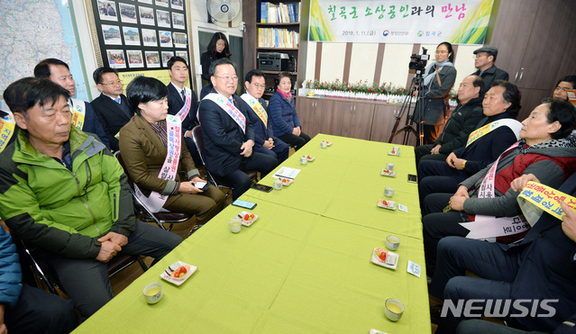 【칠곡=뉴시스】우종록 기자 = 김부겸 행정안전부 장관이 11일 오후 지역사랑상품권 현황 정취 및 활성화 캠페인 차 경북 칠곡군 왜관 전통시장을 방문, 칠곡 소상공인과의 간담회에서 인사말을 하고 있다. 2019.01.11.