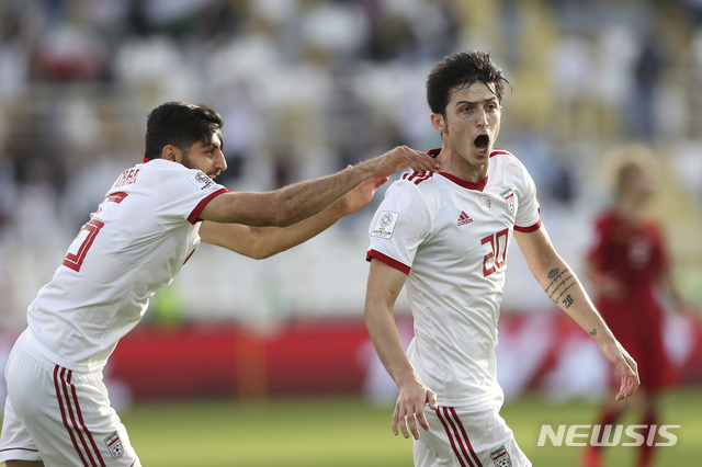 【아부다비=AP/뉴시스】12일(현지시간) 아랍에미리트 아부다비 알나얀 경기장에서 베트남과 이란의 2019 아시아축구연맹(AFC) 아시안컵 D조 2차전이 열린 가운데 후반 24분께 이란의 사르다르 아즈문(오른쪽)이 추가골을 넣고 환호하고 있다. 2019.01.12.