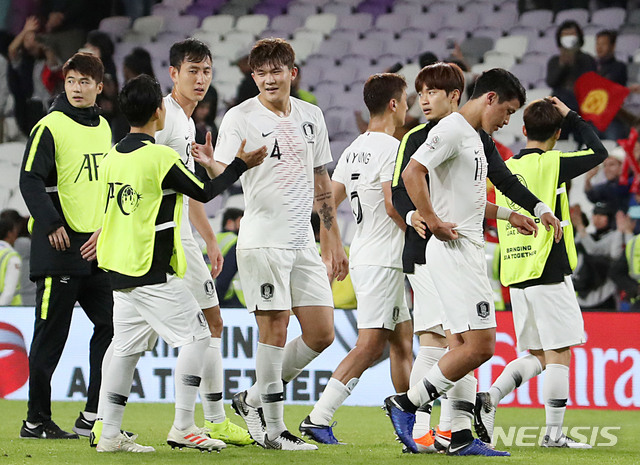 【알아인(아랍에미리트)=뉴시스】김진아 기자 = 11일 오후(현지시간) 아랍에미리트 알 아인 하자 빈 자예드 스타디움에서 열린 2019 AFC 아시안컵 C조 조별리그 2차전 한국과 키르기스스탄의 경기, 한국이 1:0으로 승리하자 김민재가 미소를 지으며 인사하고 있다. 2019.01.12.