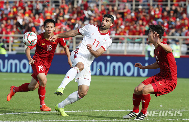 【아부다비(아랍에미리트)=뉴시스】김진아 기자 = 12일 오후(현지시간) 아랍에미리트 아부다비 알나얀 경기장에서 열린 2019 AFC 아시안컵 D조 조별리그 2차전 베트남과 이란의 경기, 이란 메흐디 타레미가 패스를 하고 있다. 2019.01.12.