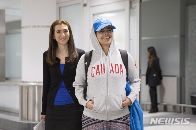 【토론토=AP/뉴시스】가족으로부터 학대를 받았다고 주장하며 탈출한 사우디아라비아 소녀 라하프 무함마드 알쿠눈(오른쪽)이 12일(현지시간) 망명을 허용한 캐나다 토론토 피어슨 국제공항에 도착해 포즈를 취하고 있다. 왼쪽 여성은 캐나다 이민 관련 부처 직원이다. 2019.01.13