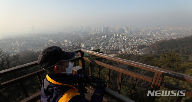 【서울=뉴시스】이윤청 수습기자 = 전국 대부분 지역에서 초미세먼지 농도 '나쁨' 수준을 보이며 미세먼지 비상저감조치가 시행된 13일 오전 서울 남산에서 한 시민이 마스크를 쓰고 도심을 바라보고 있다.
