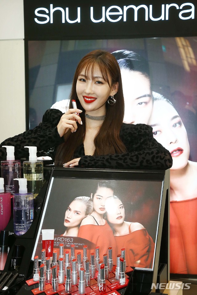 【서울=뉴시스】최진석 기자 = 13일 오후 서울 중구 신세계백화점 본점에서 진행된 메이크업 아티스트 브랜드 슈에무라(shu uemura)의 NEW 레드립(데일리 레드 RD163) 행사에 참석한 뷰티 크리에이터 이사배가 슈에무라 매장을 방문해 레드립 제품 앞에서 포즈를 취하고 있다. 2019.01.13.(사진제공=슈에무라)