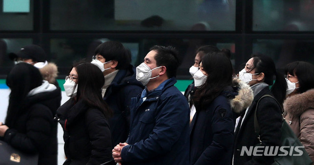 【서울=뉴시스】추상철 기자 =최악의 미세먼지로 '고농도 미세먼지 비상저감조치'가 시행된 14일 오전 서울 종로구 세종대로 인근 도심에서 시민들이 마스크를 쓰고 출근을 하고 있다. 2019.01.14.