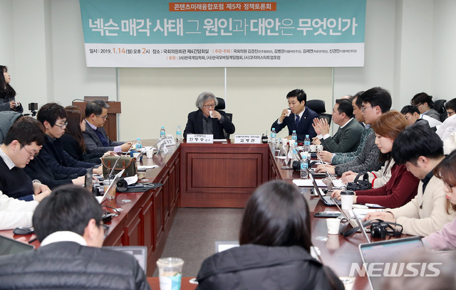 【서울=뉴시스】이종철 기자  = 14일 서울 여의도 국회 의원회관에서 열린 '넥슨 매각사태 그 원인과 대안은 무엇인가' 정책토론회에서 참석자들이 발언을 하고 있다. 2019.01.14.
