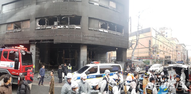 【천안=뉴시스】함형서 기자 = 전날 오후 4시 천안 서북구 쌍용동 라마다앙코르호텔에서 화재가 발생해 20명의 사상자가 발생한 가운데 15일 오후 소방청, 한국가스안전공사,국과수 등 합동감식팀이 현장 감식을 위해 회의를 하고 있다. 2019.01.15.