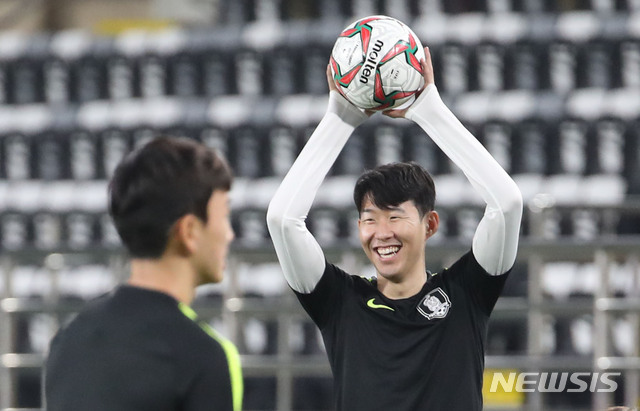 【아부다비(아랍에미리트)=뉴시스】김진아 기자 = 2019 AFC 아시안컵 C조 조별리그 3차전 한국과 중국의 경기를 하루 앞둔 15일 오후(현지시간) 아랍에미리트 아부다비 알 나얀 스타디움에서 한국 축구대표팀 손흥민과 선수들이 훈련을 하고 있다. 2019.01.15.