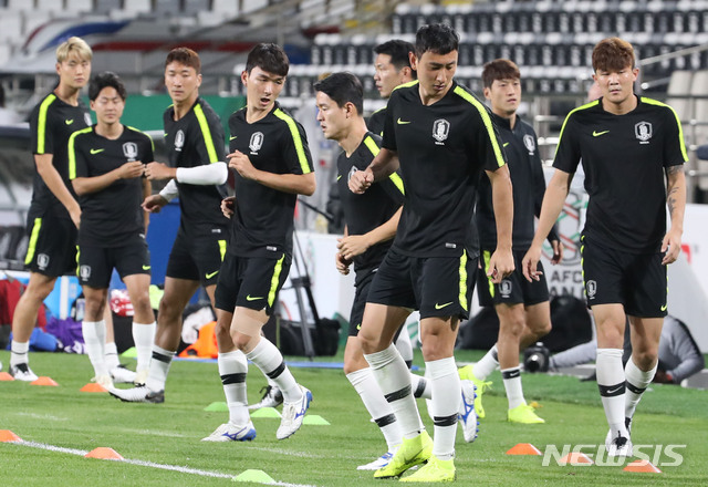 【아부다비(아랍에미리트)=뉴시스】김진아 기자 = 2019 AFC 아시안컵 C조 조별리그 3차전 한국과 중국의 경기를 하루 앞둔 15일 오후(현지시간) 아랍에미리트 아부다비 알 나얀 스타디움에서 한국 축구대표팀 황인범, 지동원 등 선수들이 훈련을 하고 있다. 2019.01.15.