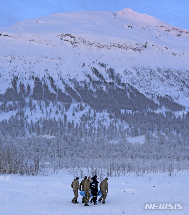 【트롬세(노르웨이)=AP/뉴시스】17일(현지시간) 노르웨이 북부 도시 트롬세 인근 타목 밸리에서 산악구조대가 눈사태 희생자 시신을 헬기로 옮기고 있다.