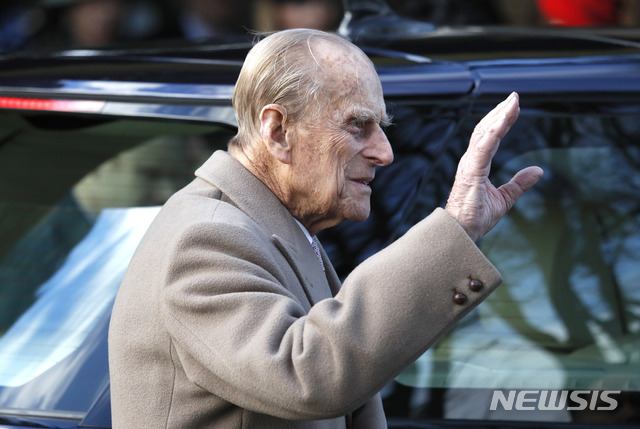 【노퍽=AP/뉴시스】 17일(현지시간) 영국 엘리자베스 2세 여왕(97)의 남편 필립공(97·에든버러 공작)이 운전 중 차량이 전복되는 사고를 당하며 영국에서 고령층의 운전 허용 문제를 놓고 논쟁이 일었다. 사진은 2016년 12월 동부 노퍽 카운티의 왕실별장인 샌드링엄 하우스 인근에서 손을 흔들고 있는 필립공. 2019.01.18.