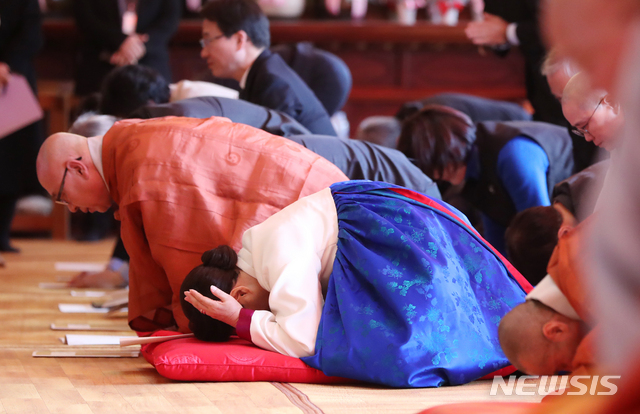 【서울=뉴시스】전신 기자 = 문재인 대통령 부인 김정숙 여사가 18일 서울 종로구 조계사에서 열린 2019 한국불교지도자 신년 하례법회에서 삼배하고 있다. 2019.01.18.