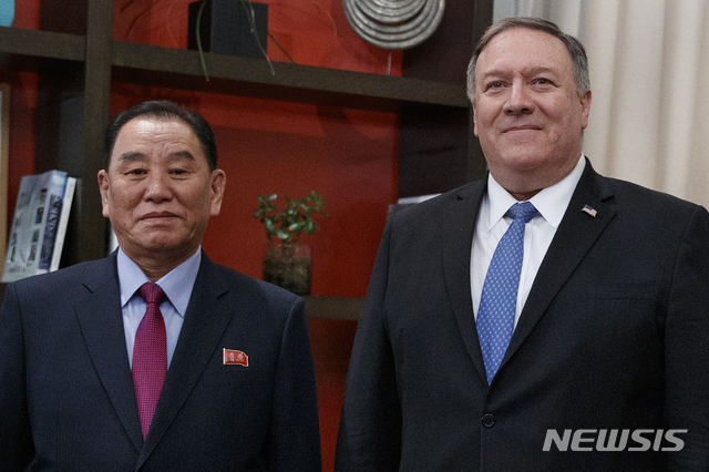 【워싱턴=AP/뉴시스】김영철 북한 노동당 부위원장(왼쪽)이 18일(현지시간) 워싱턴DC 듀폰서클호텔에서 마이크 폼페이오 미국 국무장관과 회담에 앞서 기념촬영을 하고 있다. 2019.01.19.