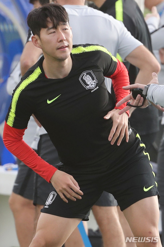 【두바이(아랍에미리트)=뉴시스】김진아 기자 = 19일 오후(현지시간) 아랍에미리트 두바이 NAS 스포츠 컴플렉스에서 축구 국가대표팀 손흥민이 훈련에 앞서 몸을 풀고 있다. 2019.01.19.