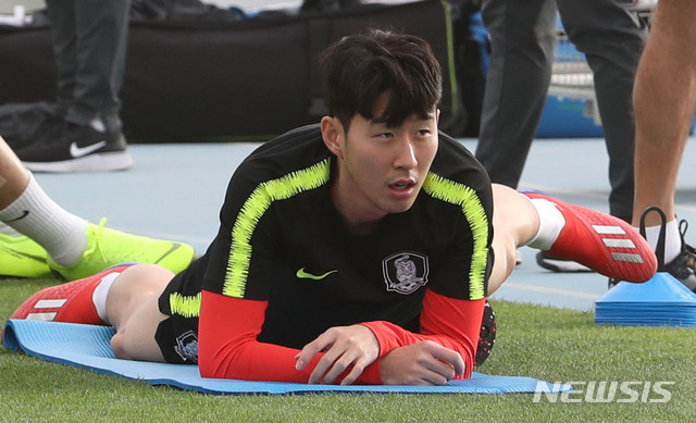 【두바이(아랍에미리트)=뉴시스】김진아 기자 = 19일 오후(현지시간) 아랍에미리트 두바이 NAS 스포츠 컴플렉스에서 축구 국가대표팀 손흥민이 훈련에 앞서 몸을 풀고 있다. 2019.01.19.