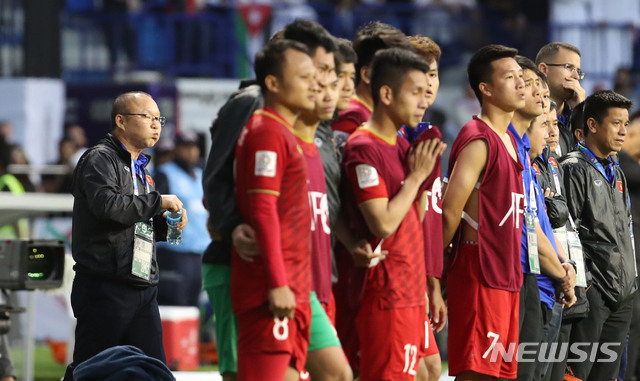 【두바이(아랍에미리트)=뉴시스】김진아 기자 = 20일 오후(현지시간) 아랍에미리트 두바이 알막툼 스타디움에서 열린 2019 AFC 아시안컵 16강전 베트남과 요르단의 경기, 베트남 축구대표팀 박항서 감독이 승부차기 중 물을 마시고 있다. 2019.01.20.