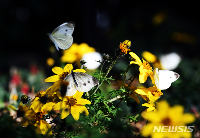【남해=뉴시스】차용현 기자 = 22일 오전 오는 3월 재개장을 앞둔 경남 남해군 삼동면 내산마을 인근 나비생태공원에서 갓 우화된 나비들이 꽃잎에 앉아 꿀을 따고 있다. 2019.01.22.