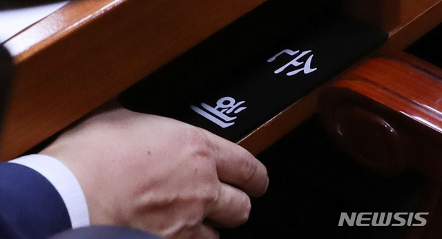 문체위원 사임계 제출한 손혜원 의원 명패 치우는 관계자
