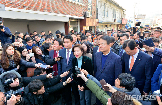 【목포=뉴시스】신대희 기자 = 나경원 자유한국당 원내대표와 정용기 정책위의장, 정양석 수석부대표, 이만희 원내대변인 등 한국당 원내지도부와 한선교 '손혜원 랜드게이트 진상규명 TF' 위원장 등이 22일 오후 전남 목포시 근대역사문화공간인 대의동 일대를 둘러봤다. 나 원내대표가 취재진 질문에 답하고 있다. 2019.01.22.