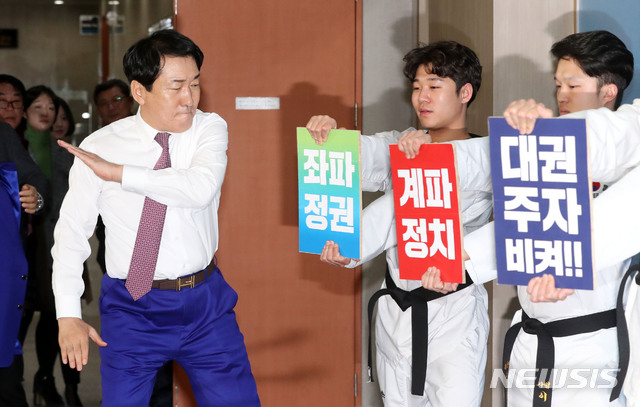 【서울=뉴시스】홍효식 기자 = 자유한국당 안상수 의원이 23일 오전 서울 여의도 국회 본청 정론관에서 전당대회 출마 기자회견에 앞서 '좌파정권, 계파정치, 대권주자 비켜'가 적힌 송판을 격파하고 있다. 2019.01.23.