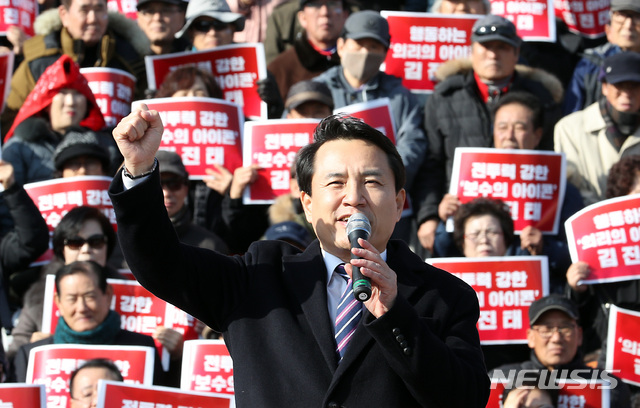 【서울=뉴시스】이종철 기자 = 자유한국당 김진태 의원이 지지자들의 환호속에 23일 서울 여의도 국회의사당 앞 계단에서 당 대표 출마 기자회견을 하고 있다. 2019.01.23. [email protected]