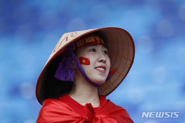 【두바이=AP/뉴시스】24일(현지시간) 아랍에미리트(UAE) 두바이 알막툼 스타디움에서 베트남과 일본의 2019 AFC 아시안컵 8강전이 열린 가운데 베트남 응원단이 전통 모자 '농'을 쓰고 응원을 펼치고 있다. 2019.01.24.