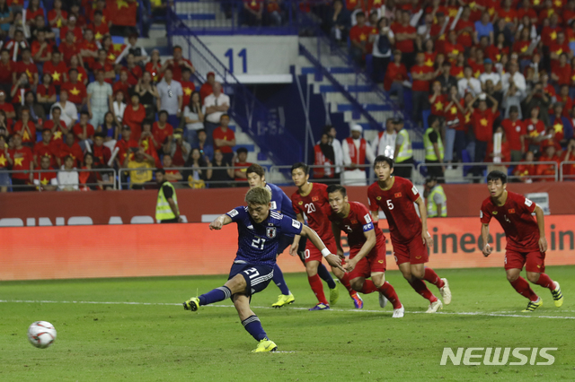 【두바이=AP/뉴시스】24일(현지시간) 아랍에미리트(UAE) 두바이 알막툼 스타디움에서 베트남과 일본의 2019 AFC 아시안컵 8강전이 열린 가운데 일본의 도안 리츠가 후반 10분께 VAR 판독으로 얻어낸 페널티킥을 성공시키고 있다.