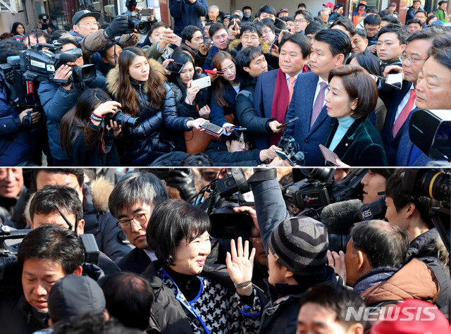 【목포=뉴시스】신대희 기자 = 전남 목포 근대역사문화공간 내 부동산 투기 의혹에 관련해 나경원(사진 위) 자유한국당 원내대표와 정용기 정책위의장, 정양석 수석부대표, 이만희 원내대변인 등 한국당 원내지도부와 한선교 '손혜원 랜드게이트 진상규명 TF' 위원장 등이 22일 오후 전남 목포시 근대역사문화공간인 대의동 일대를 둘러 본 다음날 23일 손혜원 의원이 목포시 대의동 박물관 건립 예정지에서 의혹 해명 기자 간담회를 열기 위해 이동하고 있다. 2019.01.26