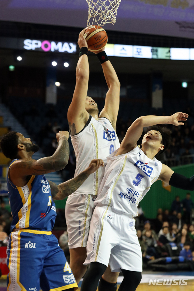【서울=뉴시스】김병문 수습기자 = 25일 오후 서울 송파구 잠실실내체육관에서 열린 2018-2019 SKT 5GX 프로농구 서울 삼성 썬더스와 전주 KCC 이지스의 경기, KCC 하승민이 리바운드를 따내고 있다. 2019.01.25.