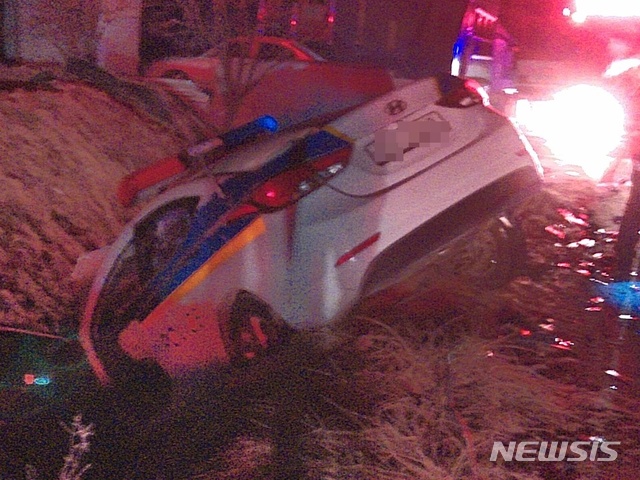 【익산=뉴시스】윤난슬 기자 = 25일 오후 11시 44분께 전북 익산시 여산면 여산리의 한 도로에서 사고 조사를 위해 출동하던 경찰차와 승용차가 충돌하는 사고가 발생해 경찰관 1명이 사망했다. 도로 옆 배수로에 경찰차 한 대가 처박혀 있는 모습. 2019.01.26.(사진=전북소방본부 제공)