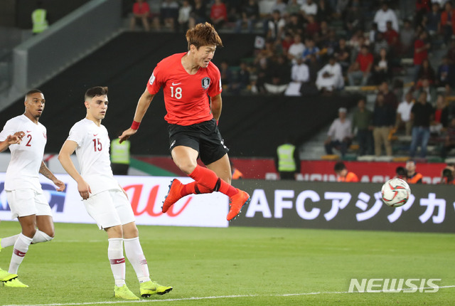 【아부다비(아랍에미리트)=뉴시스】김진아 기자 = 25일 오후(현지시간) 아랍에미리트 아부다비 자예드 스포츠 시티 스타디움에서 열린 AFC 아시안컵 8강전 한국과 카타르의 경기, 한국 황의조가 슛을 시도하고 있다. 결과는 VAR 판정 결과 노골. 2019.01.25.