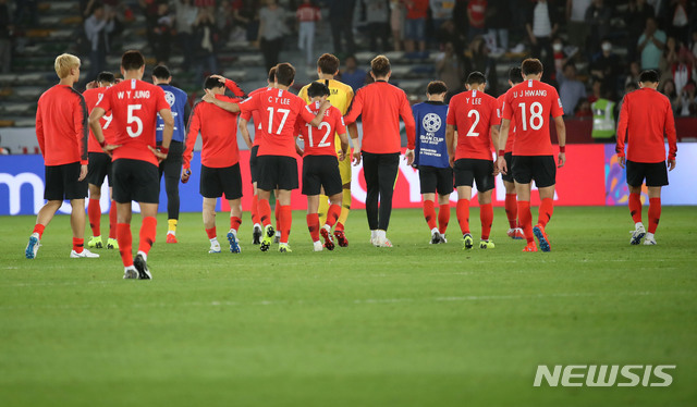 아부다비(아랍에미리트)=뉴시스】김진아 기자 = 25일 오후(현지시간) 아랍에미리트 아부다비 자예드 스포츠 시티 스타디움에서 열린 AFC 아시안컵 8강전 한국과 카타르의 경기, 1:0으로 패한 한국 선수들이 아쉬워하고 있다. 2019.01.25.