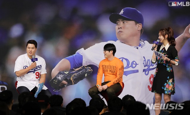 【서울=뉴시스】 고범준 기자 = LA 다저스 류현진이 27일 오후 서울 강남구 청담동 리베라호텔에서 열린 'MLB 9이닝스와 함께하는 팬 미팅' 행사에 참석해 팬들과 함께 퀴즈게임을 하고 있다. 2019.01.27.