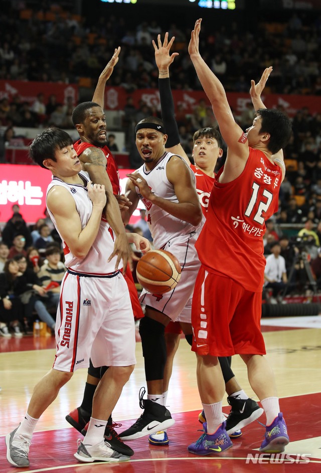 고【서울=뉴시스】 고범준 기자 = 27일 오후 서울 송파구 잠실학생체육관에서 열린 2018-2019 SKT 5GX 프로농구 서울 SK 나이츠와 울산 현대모비스 피버스의 경기, 현대모비스 문태종(가운데)이 상대 수비수와 공 다툼을 벌이다 놓치 있다. 2019.01.27.