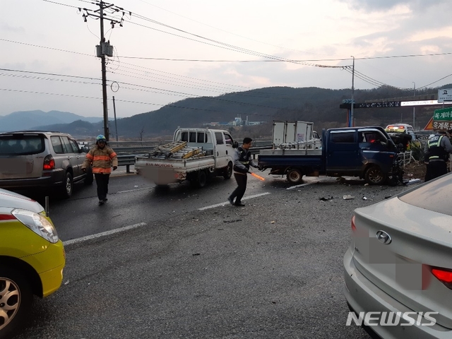 【영동=뉴시스】이성기 기자 = 28일 오전 충북 영동군 심천면 고당리 옥계폭포 입구∼약목리 구간 4번 국도에서 빙판길에 미끄러지면서 잇따라 교통사고가 발생한 현장에 차량이 뒤엉켜 있다.2019.01.28.(사진=영동소방서 제공)