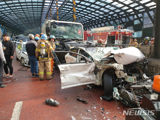 【용인=뉴시스】 28일 오전 경기도 용인시 수지구 꽃메교차로 부근에서 29중 추돌사고로 중상 3명 경상 7명이 발생했다.