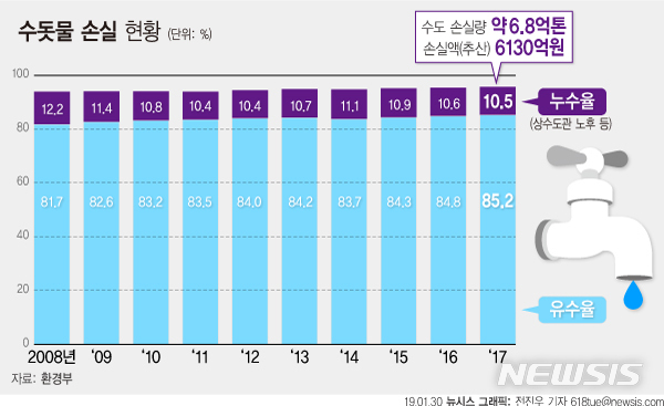 【서울=뉴시스】환경부가 30일 발표한 상수도 통계에 따르면 2017년 기준 줄줄 새는 수돗물은 총 생산량의 10.5%인 약 6억8200만t이다. 생산원가로 환산하면 손실액은 6130억원으로 추산된다. (그래픽=전진우 기자)