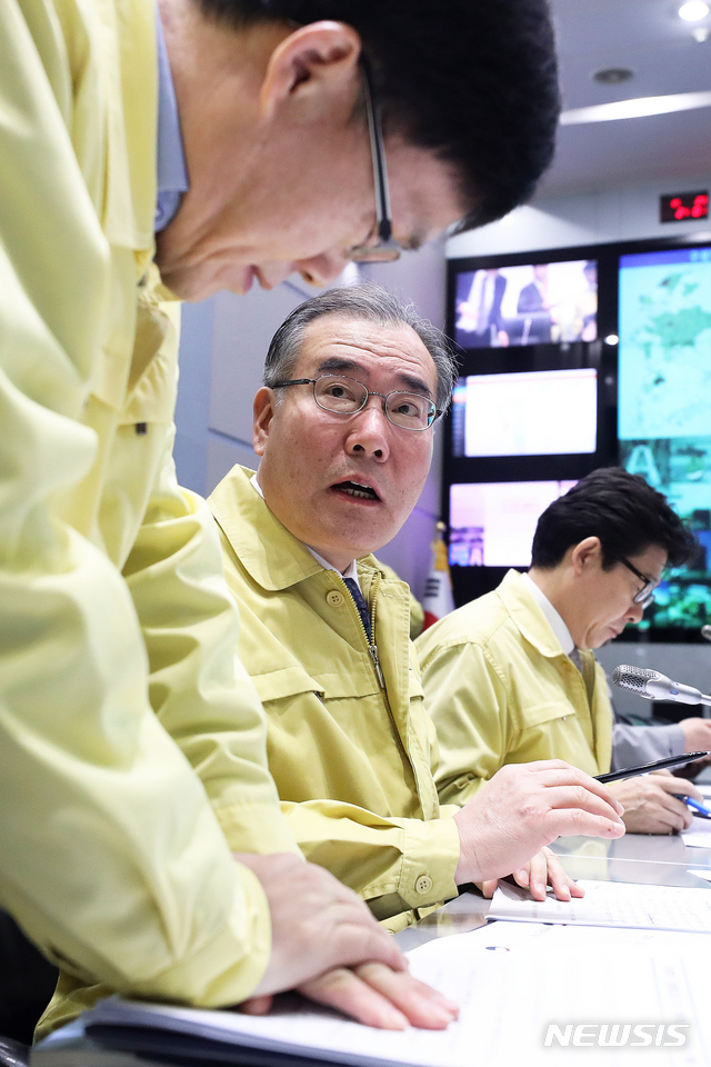 【서울=뉴시스】김병문 수습기자 = 이개호 농림축산식품부 장관이 29일 오전 서울 종로구 정부서울청사에서 열린 '구제역 상황점검 및 대책 회의'에 참석해 관계자와 대화를 나누고 있다.