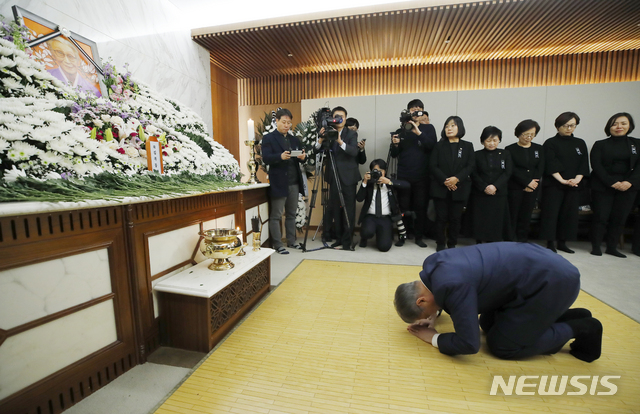 【서울=뉴시스】전신 기자 = 문재인 대통령이 29일 서울 서대문구 신촌세브란스병원 장례식장에 마련된 일본군 ‘위안부’ 피해자 고 김복동 할머니 빈소를 찾아 조문하고 있다. 2019.01.29.