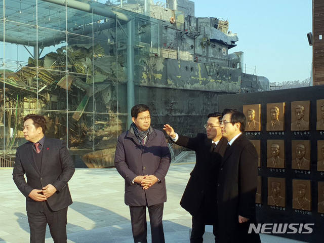 【서울=뉴시스】박영태 기자 = 자유한국당 당권 주자인 황교안 전 국무총리가 30일 오전 경기 평택시 제2함대 사령부 내 천안함 전시 현장을 찾아 군 관계자의 설명을 듣고 있다. 2019.01.30.(사진=황교안 전 총리 제공)